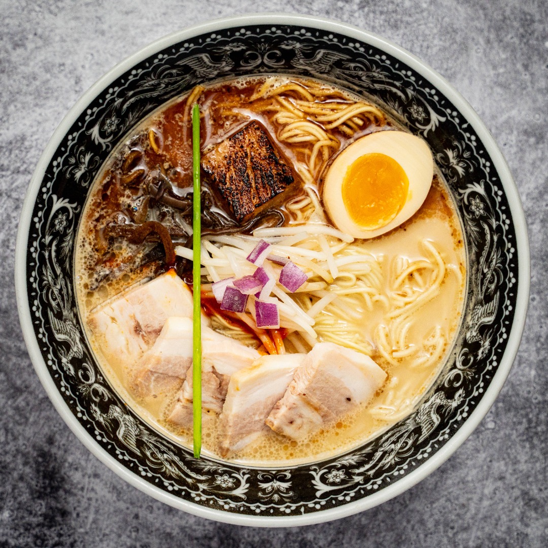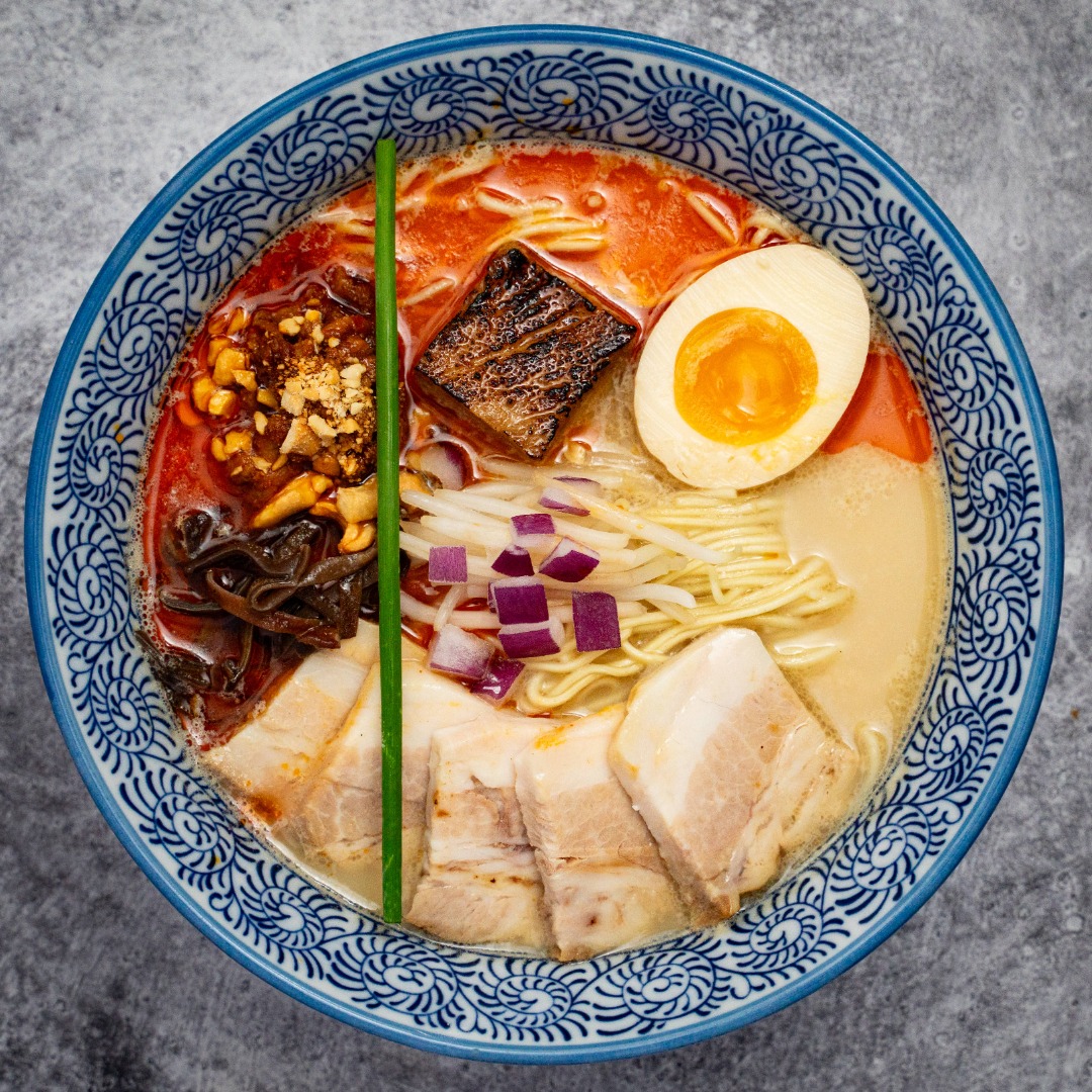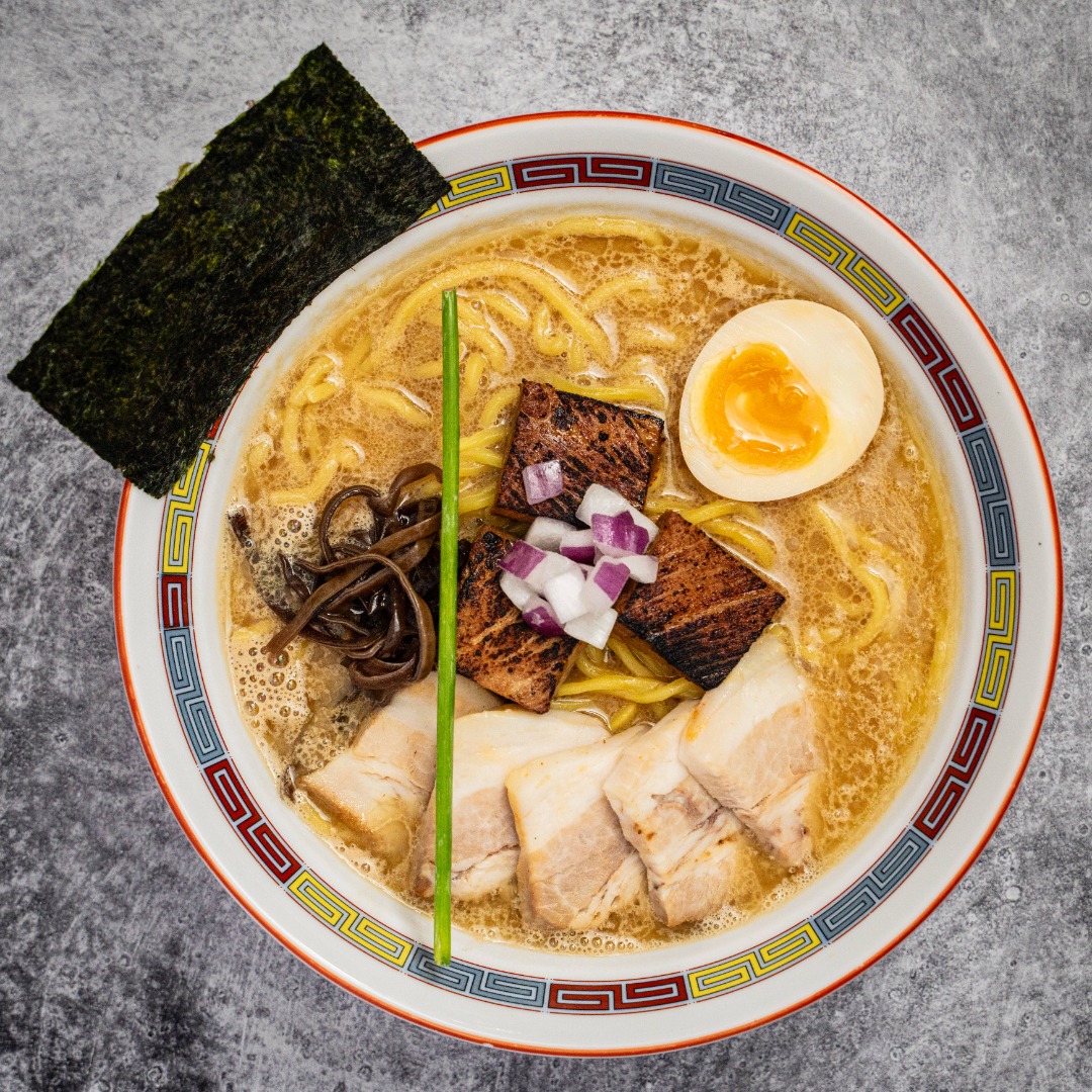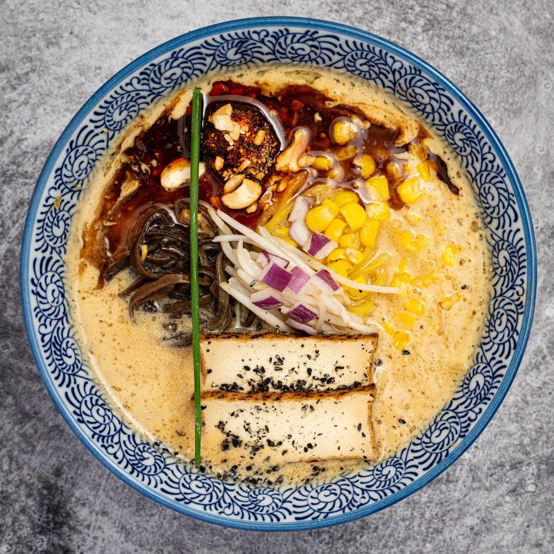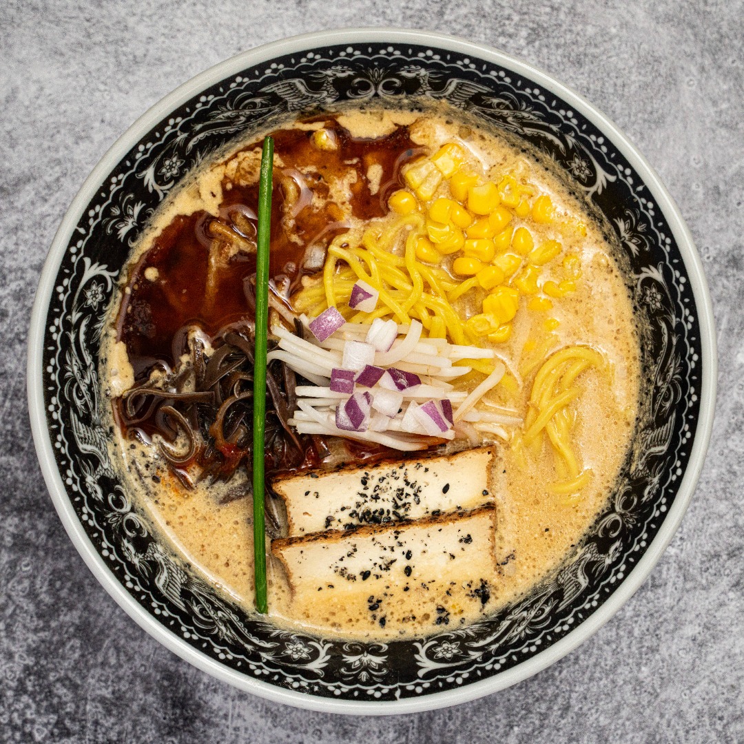 Miso and sesame broth with thick noodles. Topped with black garlic oil, bean sprouts, tofu chashu, diced red onion, chive, kikurage mushrooms, corn, and savory umami paste. Gluten-free rice noodles are available to make gluten-free
