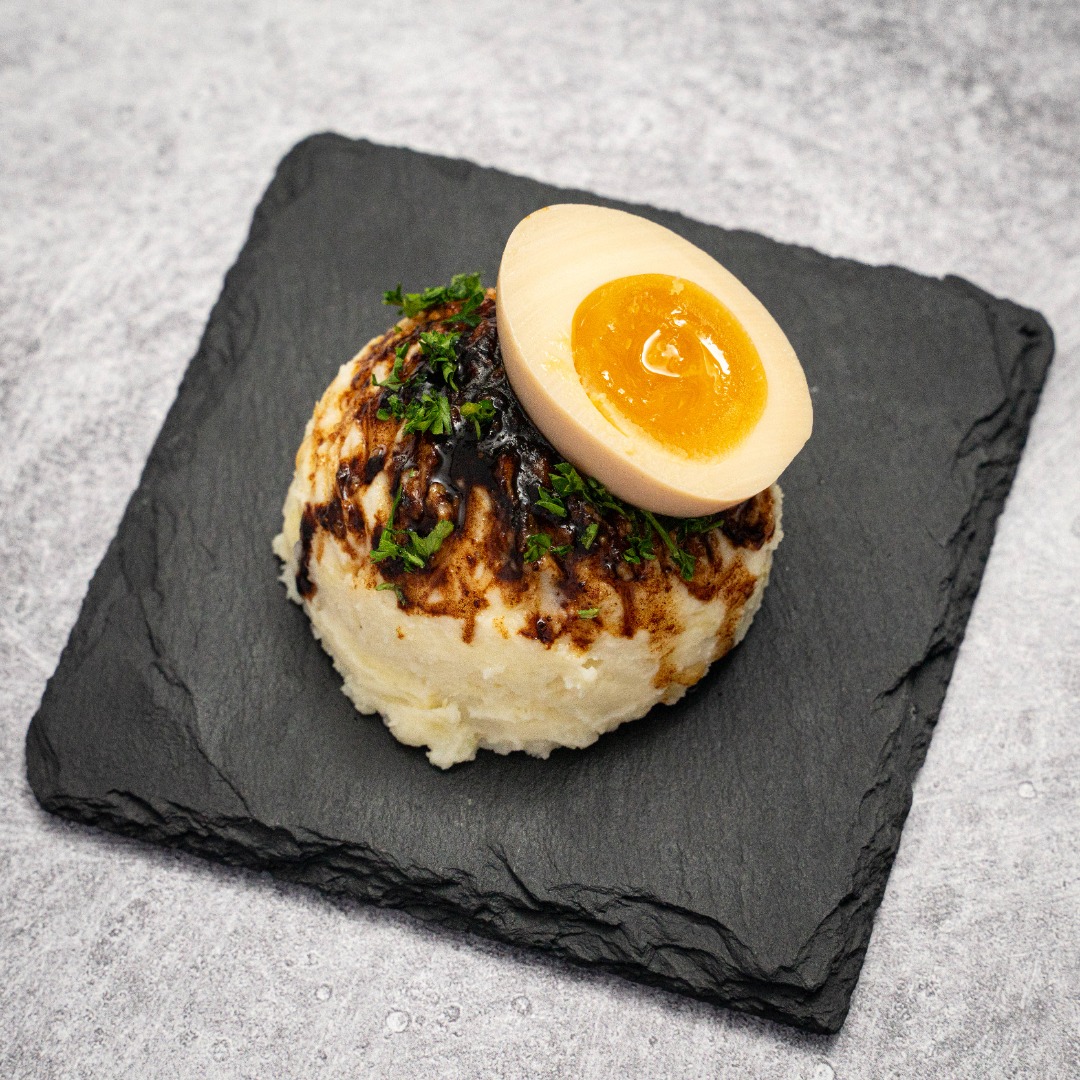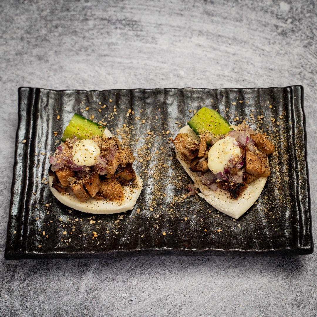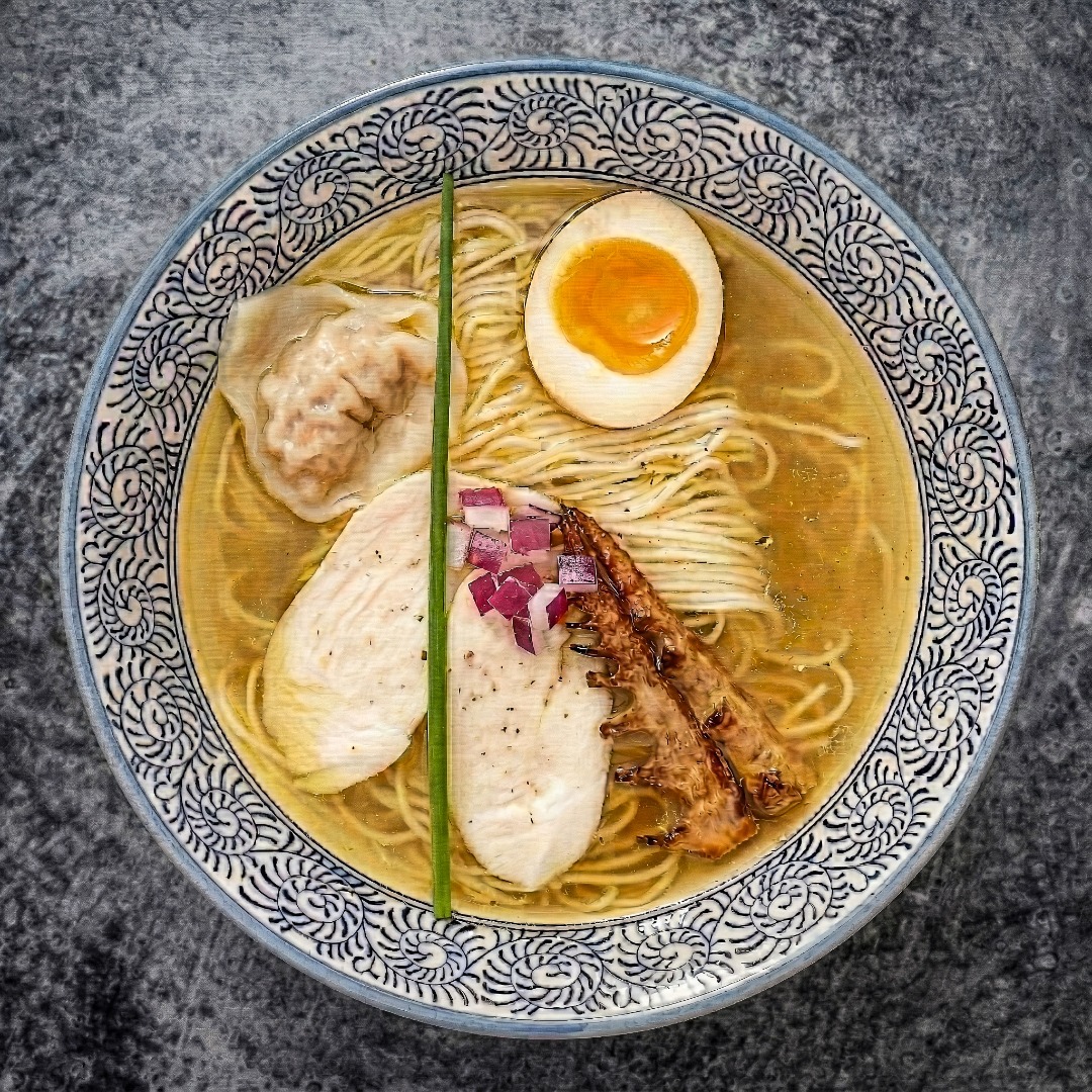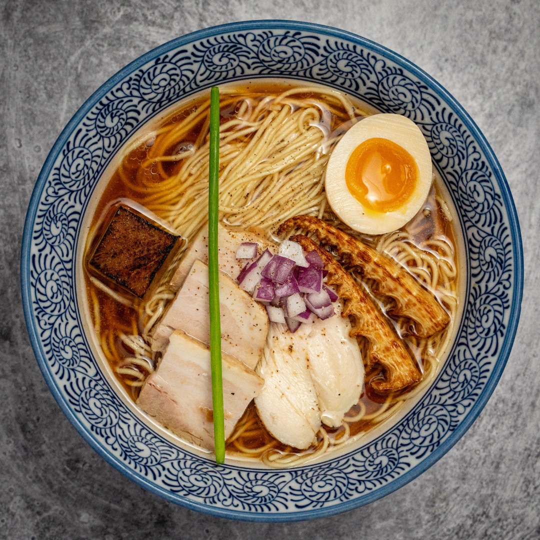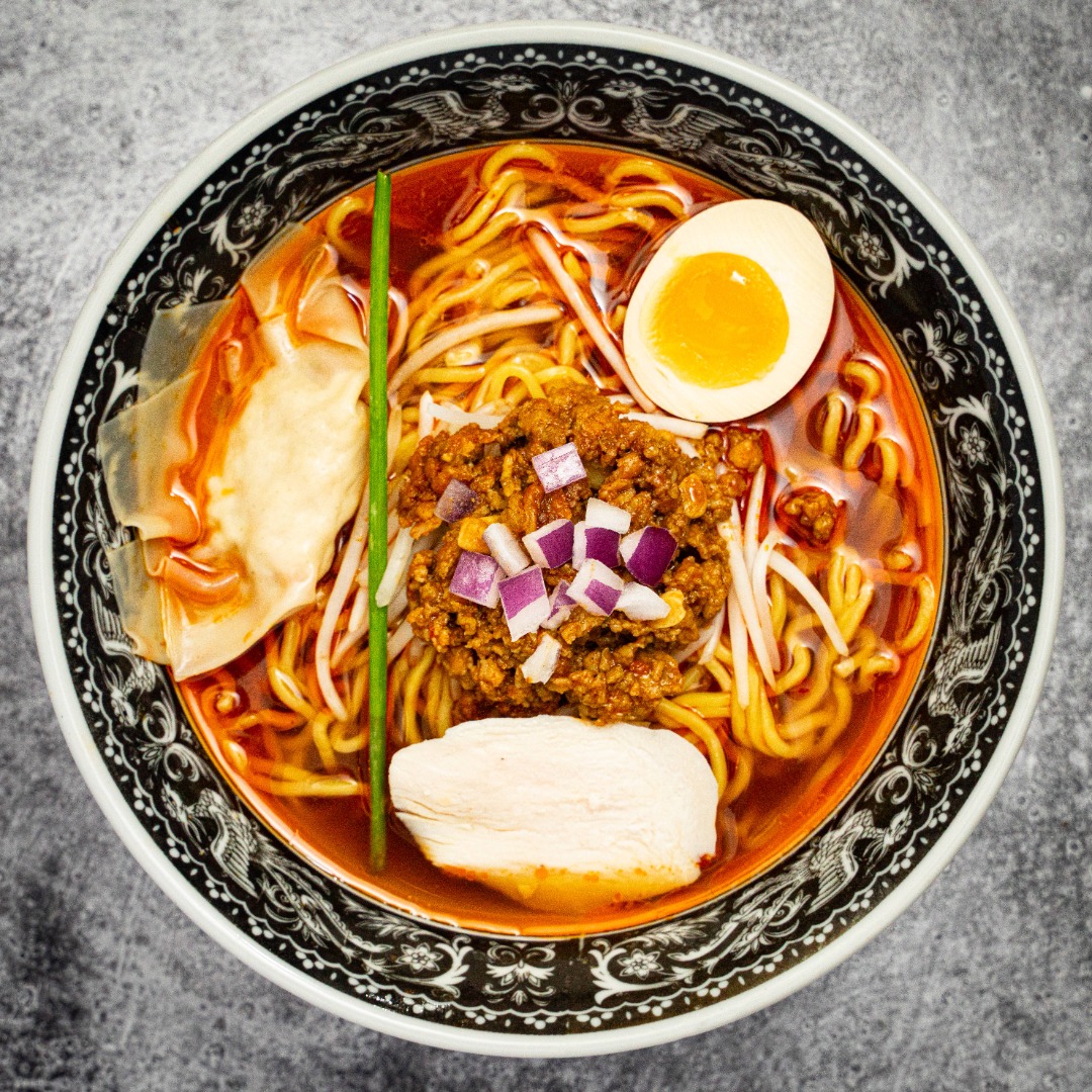 Miso and sesame broth with thick noodles. Topped with black garlic oil, bean sprouts, tofu chashu, diced red onion, chive, kikurage mushrooms, corn, and savory umami paste. Gluten-free rice noodles are available to make gluten-free